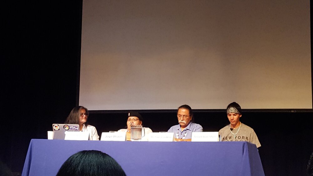 The third and final panel of this conference was titled “Decolonization and Indigenous-Centered Leadership,” moderated by Paula Antoine. Terrell Iron Shell, one of the founders of the Indigenous Youth Council, Michael Cordero, an elder of the Coastal Band of the Chumash Nation, and Joye Braun participated in the panel. Iron Shell, an Oglala Lakota and Eastern Band Cherokee, conducted nonviolent direct action trainings at Standing Rock. He believes that the youth must be the spark to light a fire in the next generation, and we must take our power back from those who are currently in charge. He asked the audience, “How long are you going to let someone else make decisions for you?” Cordero helped to found the Santa Barbara Standing Rock Coalition and to write the resolution in support of Standing Rock, which was passed by the Santa Barbara City Council in November 2016. He drew parallels between the struggle against the Dakota Access Pipeline and the Chumash’s struggle against a proposed LNG plant at Point Conception in the 1980s. He believes that one of the most important messages he learned from Standing Rock was that alliances must be formed, especially between native peoples, in order for movements to be successful. Braun shared the story of the day that the Treaty Camp was established on land that the pipeline was meant to cross, but had never been legally ceded by the tribe. She described the experience as freeing, and encouraged us all to think outside of the box like she and her comrades did that day.