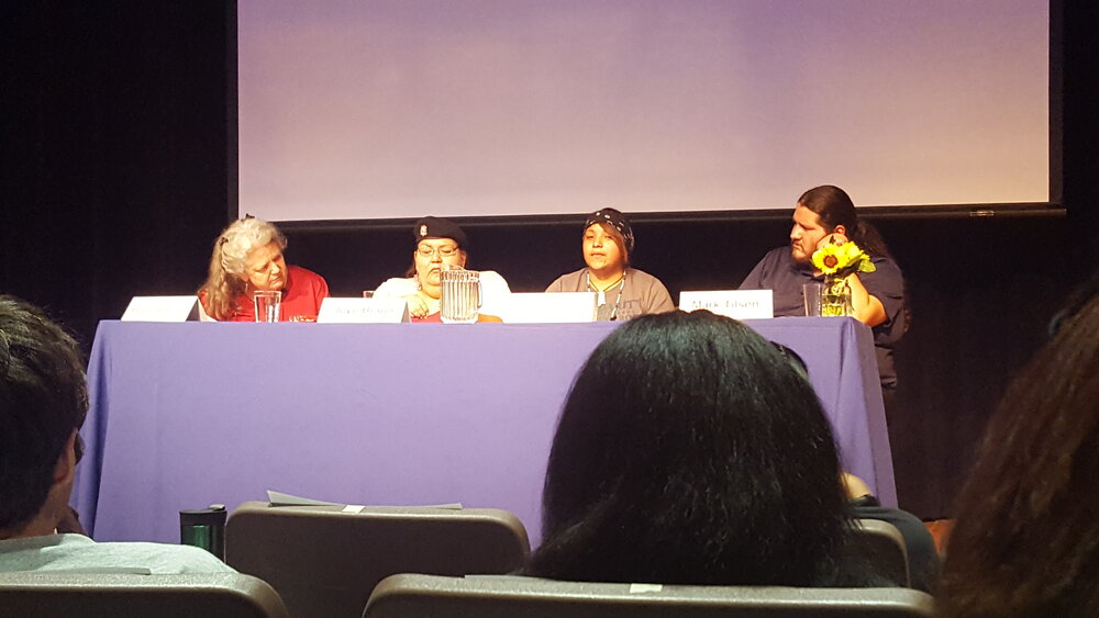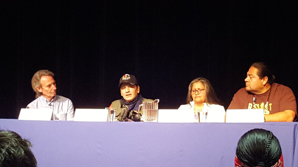 The second panel focused on media at Standing Rock. Independent filmmaker Todd Darling, who spent several months at Standing Rock documenting the struggle against DAPL, moderated. John Bigelow, Paula Antoine, and Myron Dewey spoke about their experiences as part of the media team. Bigelow, a Hunkpapa Lakota, created the Oceti Sakowin Camp website and media team to send communications from the camp to the outside world. He spoke of how he lost his “journalistic objectivity” after seeing the way the police abused the water protectors at Standing Rock; he also emphasized the importance of freedom of speech, especially under the current White House administration. Antoine, a Sicangu Lakota and grandmother, co-founded the Rosebud Spirit Camp in opposition to the Keystone XL pipeline. She served the role of cultural adviser for various tribes at Standing Rock. Dewey is from the Walker River Paiute Tribe, and founded Digital Smoke Images. He mentioned the Water Protector Legal Collective, which is providing legal assistance to 814 people arrested at Standing Rock. Antoine added that about 20% of those cases have been dismissed due to lack of evidence.
